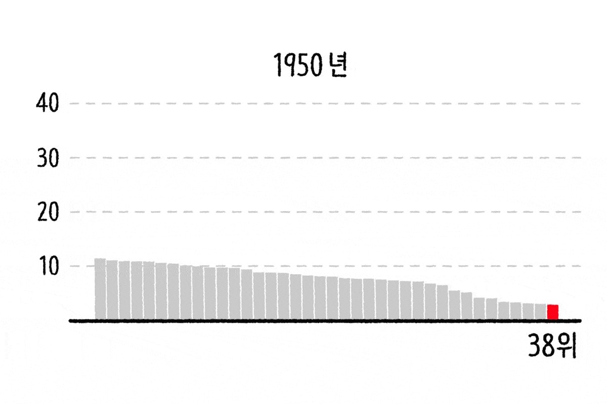 문제는 앞으로인데, 우리나라의 고령화 속도가 빠르다는 게 문제입니다. 인구의 정점은 이미 지났고 저출생의 영향으로 빠르게 늙어갈 것으로 예측되고 있거든요. 위의 움직이는 그래프는 OECD 회원국들의 65세 이상 인구의 비율을 나타낸 그래프입니다. 붉은색으로 표시된 게 바로 대한민국이죠. 65세 인구가 전체의 7% 이상이면 고령화사회, 14% 이상이면 고령사회, 20% 이상이면 초고령사회로 구분하는데, 우리나라는 1950년엔 2.7%로 가장 젊은 국가였어요. 38위라는 순위 보이죠? 하지만 미래엔 우리나라의 고령층의 비율이 엄청난 속도로 증가합니다.