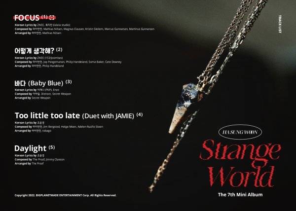 하성운은 13일 0시 공식 SNS를 통해 오는 24일 발매하는 일곱 번째 미니앨범 'Strange World (스트레인지 월드)'의 트랙리스트 이미지를 공개했다.