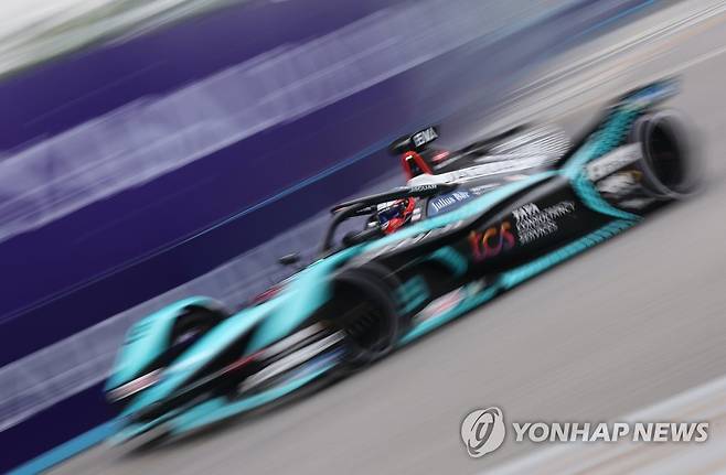 (서울=연합뉴스) 홍해인 기자 = 13일 서울 송파구 잠실올림픽주경기장 일대에서 열린 '2022 하나은행 서울 E-프리(E-Prix)' 15라운드 두 번째 연습 주행에서 경주차가 트랙을 질주하고 있다.