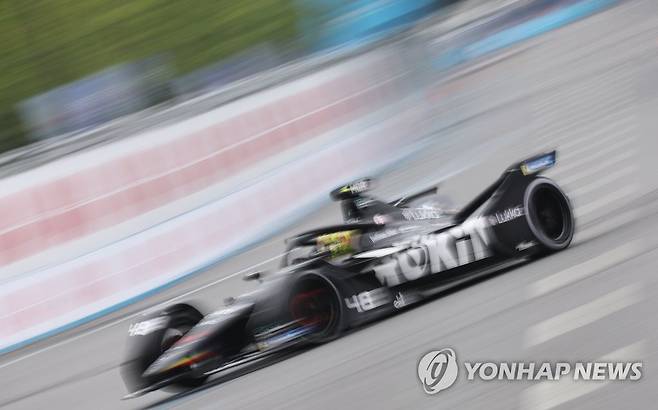 (서울=연합뉴스) 홍해인 기자 = 13일 서울 송파구 잠실올림픽주경기장 일대에서 열린 '2022 하나은행 서울 E-프리(E-Prix)' 15라운드 두 번째 연습 주행에서 로킷 벤추리 레이싱 팀의 에도아르도 모르타라의 경주차가 트랙을 질주하고 있다.