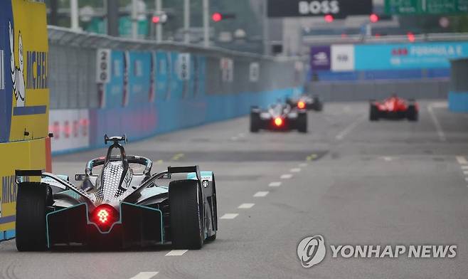 (서울=연합뉴스) 김도훈 기자 = 13일 서울 송파구 잠실올림픽주경기장 일대에서 열린 '2022 하나은행 서울 E-프리(E-Prix)' 15라운드 두번째 연습 주행에서 전기 레이싱 차량이 화염대신 LED불빛을 밝히며 질주하고 있다. 2022.8.13