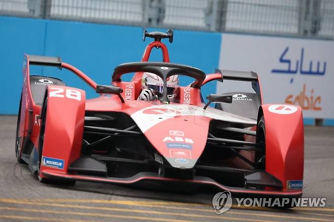 (서울=연합뉴스) 김도훈 기자 = 13일 서울 송파구 잠실올림픽주경기장 일대에서 열린 '2022 하나은행 서울 E-프리(E-Prix)' 15라운드 두번째 연습 주행에서 애벌런치 안드레티 포뮬러E의 올리버 애스큐(미국)가 트랙을 질주하고 있다. 2022.8.13