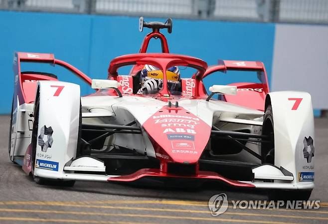 (서울=연합뉴스) 김도훈 기자 = 13일 서울 송파구 잠실올림픽주경기장 일대에서 열린 '2022 하나은행 서울 E-프리(E-Prix)' 15라운드 두번째 연습 주행에서 드래곤/펜스케 오토스포츠의 세르지오 세테 카마라(브라질)가 트랙을 질주하고 있다. 2022.8.13