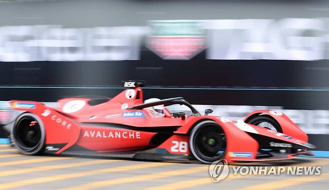 (서울=연합뉴스) 김도훈 기자 = 13일 서울 송파구 잠실올림픽주경기장 일대에서 열린 '2022 하나은행 서울 E-프리(E-Prix)' 15라운드 두번째 연습 주행에서 애벌런치 안드레티 포뮬러E의 올리버 애스큐(미국)가 트랙을 질주하고 있다. 2022.8.13
