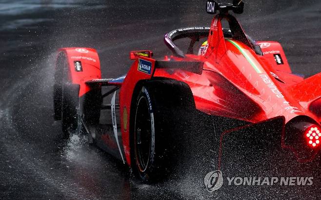 (서울=연합뉴스) 홍해인 기자 = 13일 서울 송파구 잠실올림픽주경기장 일대에서 열린 '2022 하나은행 서울 E-프리(E-Prix)' 15라운드 예선에서 폴 포지션(1위)을 차지한 마힌드라 레이싱 팀 올리버 롤랜드가 주경기장 내 13번 코너를 돌아나가고 있다.