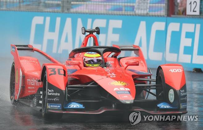 (서울=연합뉴스) 홍해인 기자 = 13일 서울 송파구 잠실올림픽주경기장 일대에서 열린 '2022 하나은행 서울 E-프리(E-Prix)' 15라운드 예선에서 폴 포지션(1위)을 차지한 마힌드라 레이싱 팀 올리버 롤랜드가 주경기장 내 트랙을 돌고 있다.