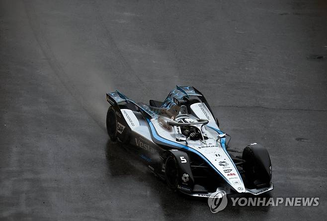 (서울=연합뉴스) 홍해인 기자 = 13일 서울 송파구 잠실올림픽주경기장 일대에서 열린 '2022 하나은행 서울 E-프리(E-Prix)' 15라운드 예선에서 14라운드까지 시즌 챔피언 자리를 지키고 있는 메르세데스-EQ 포뮬러E 팀의 스토펠 반도른(벨기에)의 경주차가 비로 인해 물보라를 일으키며 트랙을 질주하고 있다.