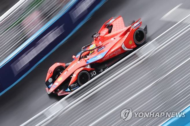 (서울=연합뉴스) 홍해인 기자 = 13일 서울 송파구 잠실올림픽주경기장 일대에서 열린 '2022 하나은행 서울 E-프리(E-Prix)' 15라운드 예선에서 폴 포지션(1위)을 차지한 마힌드라 레이싱 팀 올리버 롤랜드가 주경기장 내 트랙을 돌고 있다.