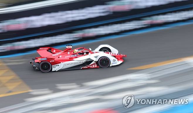 (서울=연합뉴스) 김도훈 기자 = 13일 서울 송파구 잠실올림픽주경기장 일대에서 열린 '2022 하나은행 서울 E-프리(E-Prix)' 15라운드 예선전에 출전한 드래곤/펜스케 오토스포츠의 세르지오 세테 카마라(브라질)이 트랙을 질주하고 있다. 2022.8.13