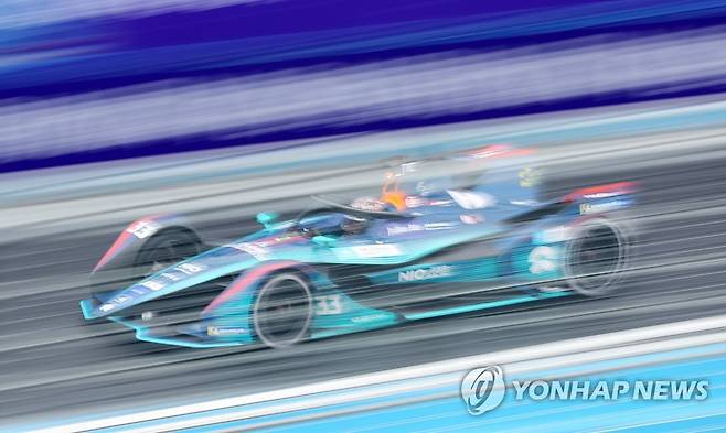 (서울=연합뉴스) 김도훈 기자 = 13일 서울 송파구 잠실올림픽주경기장 일대에서 열린 '2022 하나은행 서울 E-프리(E-Prix)' 15라운드 예선전에 출전한 니오 333 FE 팀의 댄 틱텀(영국)가 트랙을 질주하고 있다. 2022.8.13