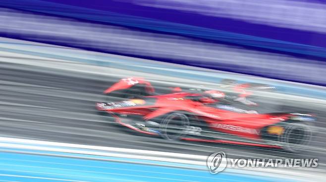(서울=연합뉴스) 김도훈 기자 = 13일 서울 송파구 잠실올림픽주경기장 일대에서 열린 '2022 하나은행 서울 E-프리(E-Prix)' 15라운드 예선전에 출전한 닛산 e.담스의 막시밀리안 귄터(독일)가 레이스를 펼치고 있다. 2022.8.13