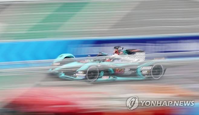 (서울=연합뉴스) 김도훈 기자 = 13일 서울 송파구 잠실올림픽주경기장 일대에서 열린 '2022 하나은행 서울 E-프리(E-Prix)' 15라운드 예선전에 출전한 재규어 TCS 레이싱의 미치 에반스(뉴질랜드)가 트랙을 질주하고 있다. 2022.8.13