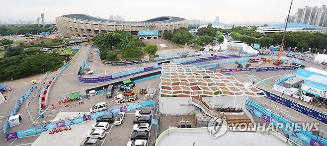 (서울=연합뉴스) 김도훈 기자 = 13일 서울 송파구 잠실올림픽주경기장 일대에서 열린 '2022 하나은행 서울 E-프리(E-Prix)' 15라운드 예선전이 진행되고 있다. 2022.8.13
