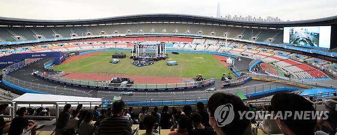 (서울=연합뉴스) 홍해인 기자 = 13일 서울 송파구 잠실올림픽주경기장 일대에서 열린 '2022 하나은행 서울 E-프리(E-Prix)' 15라운드 예선에서 관람객들이 트랙을 도는 경주차들의 모습을 바라보고 있다.