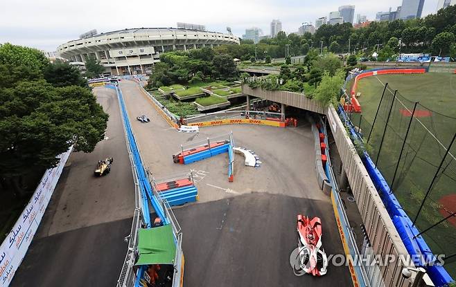 (서울=연합뉴스) 홍해인 기자 = 13일 서울 송파구 잠실올림픽주경기장 일대에서 열린 '2022 하나은행 서울 E-프리(E-Prix)' 15라운드 예선에서 경주차들이 주경기장 내 트랙으로 진입하고 있다.