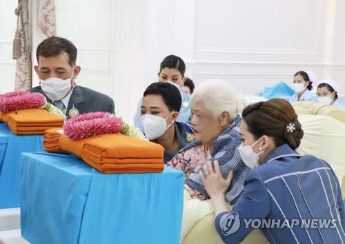 epa10118298 A handout photo made available by the Royal Household Bureau of Thailand shows Thai Queen Mother Sirikit (2-R) offering saffron robes to Buddhist monks as she celebrates her 90th birthday surrounded by royal family members, Thai King Maha Vajiralongkorn Bodindradebayavarangkun (L), Queen Suthida (R), and Princess Bajrakitiyabha (2-L), at King Chulalongkorn Memorial Hospital in Bangkok, Thailand, 12 August 2022 (issued 13 August 2022). EPA/ROYAL HOUSEHOLD BUREAU HANDOUT EDITORIAL USE ONLY/ NO SALES HANDOUT EDITORIAL USE ONLY/NO SALES