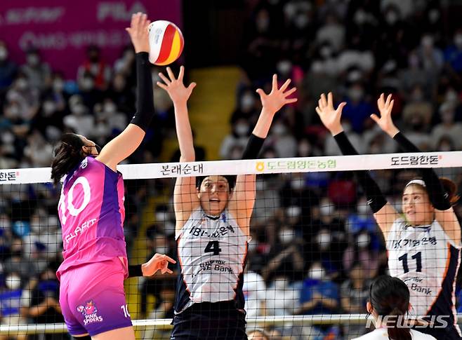 [순천=뉴시스] 이영주 기자 = 13일 오후 전남 순천시 팔마실내체육관에서 열린 2022 순천 도드람컵 프로배구대회 여자부 개막전 흥국생명과 IBK기업은행의 경기, 흥국생명 김연경의 스파이크를 IBK 기업은행 김희진과 김수지가 블로킹하고 있다. 2022.08.13. leeyj2578@newsis.com