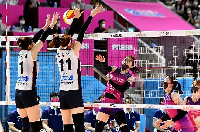 [순천=뉴시스] 이영주 기자 = 13일 오후 전남 순천시 팔마실내체육관에서 열린 2022 순천 도드람컵 프로배구대회 여자부 개막전 흥국생명과 IBK기업은행의 경기, 흥국생명 김미연의 스파이크를 IBK 기업은행 육서영과 김수지가 블로킹하고 있다. 2022.08.13. leeyj2578@newsis.com
