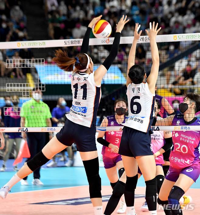 [순천=뉴시스] 이영주 기자 = 13일 오후 전남 순천시 팔마실내체육관에서 열린 2022 순천 도드람컵 프로배구대회 여자부 개막전 흥국생명과 IBK기업은행의 경기, IBK기업은행 김수지와 이진이 블로킹을 하고 있다. 2022.08.13. leeyj2578@newsis.com