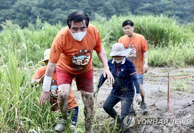 (보령=연합뉴스) 정찬욱 기자 = 아시아 처음으로 13일 충남 보령 웅천 체육공원 특설 어드벤처 파크에서 열린 '2022 터프 머더(Tough Mudder) 어드벤처 대회'에 참가한 김동일 보령시장이 진흙탕 길을 통과하고 있다. 미국 등 해외에서 큰 인기를 끌고 있는 터프 머더는 5㎞ 길이의 대회장 각 구간 장애물 넘기, 진흙 장애물 통과하기 등을 통해 동반 참여자 간 유대와 협동심, 체력을 기르는 이벤트다. 2022.8.13