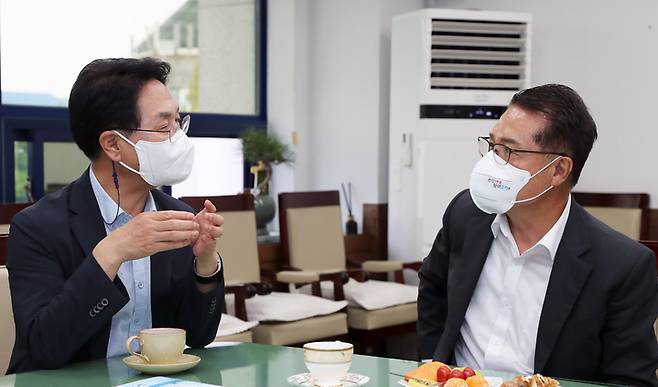 [고창=뉴시스] 김종효 기자 = 13일 전북 고창군청을 방문한 국민의힘 정운천(오른쪽) 국회의원에게 심덕섭(왼쪽) 고창군수가 '한국의 갯벌 세계자연유산보전본부' 유치의 최적지가 고창임을 설명하고 있다. (사진=고창군청 제공) 2022.08.13. photo@newsis.com
