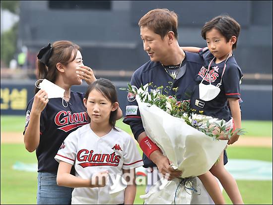 [마이데일리 = 광주 송일섭 기자] 롯데 이대호가 13일 오후 광주광역시 광주기아챔피언스필드에서 진행된 '2022 KBO리그' KIA 타이거즈와 롯데 자이언츠의 경기 전 진행된 은퇴투어 행사에서 가족과 함께 포토타임을 갖고 있다.