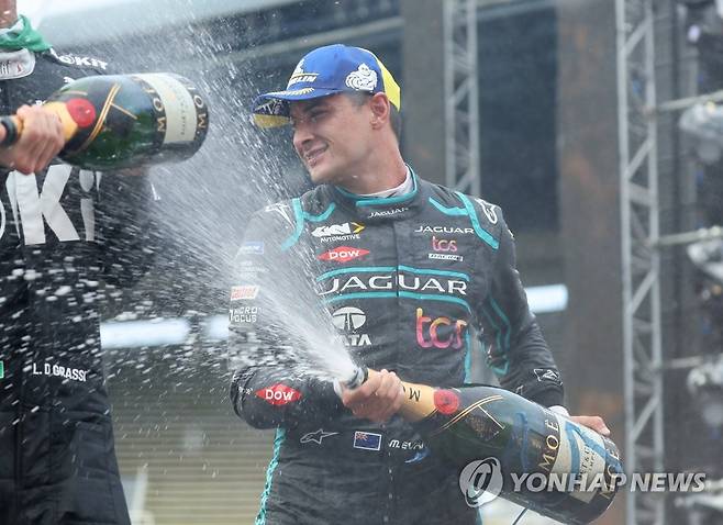 (서울=연합뉴스) 홍해인 기자 = 13일 서울 송파구 잠실올림픽주경기장 일대에서 열린 '2022 하나은행 서울 E-프리(E-Prix)' 15라운드 경기에서 우승을 차지한 재규어 TCS 레이싱 미치 에반스(뉴질랜드)가 시상식에서 샴페인 세리머니를 하고 있다.