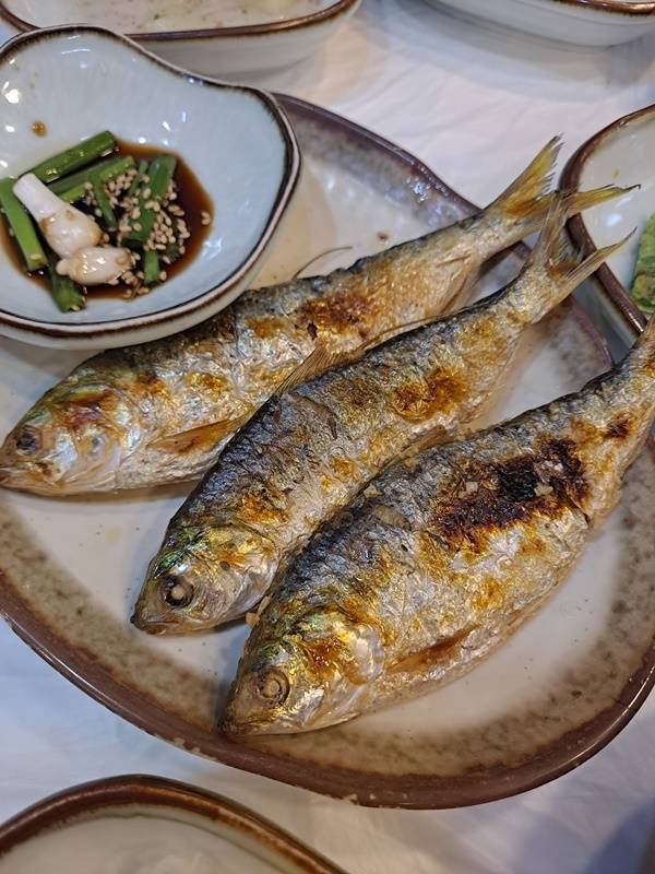 이어서 전어구이다. 그냥 보기만 해도 군침이 돈다. 전어에 칼집을 내어 노릇노릇 구워낸 전어구이는 손으로 들고 전어 대가리를 아작 깨물어 먹어야 제맛이다. 깨가 서 말이라는 전어 대가리와 고소한 전어 내장이 한데 어우러져야 전어 본연의 맛을 제대로 만끽할 수 있다.