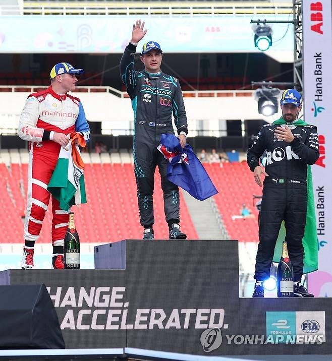 (서울=연합뉴스) 김도훈 기자 = 13일 서울 송파구 잠실올림픽주경기장 일대에서 열린 '2022 하나은행 서울 E-프리(E-Prix)' 15라운드 본경기 입상자들이 포디움에 올라서 있다.