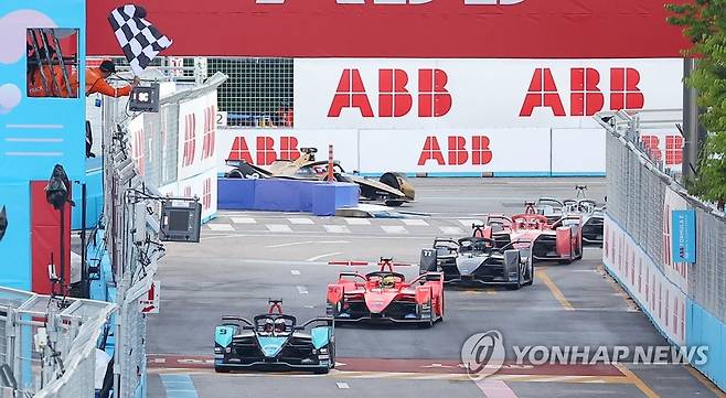 (서울=연합뉴스) 김도훈 기자 = 13일 서울 송파구 잠실올림픽주경기장 일대에서 열린 '2022 하나은행 서울 E-프리(E-Prix)' 15라운드 본경기에서 재규어 TCS 레이싱의 미치 에반스(뉴질랜드)의 차량이 결승선을 가장 먼저 통과하고 있다.