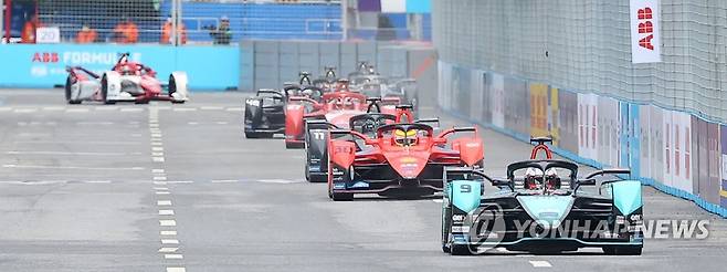 (서울=연합뉴스) 김도훈 기자 = 13일 서울 송파구 잠실올림픽주경기장 일대에서 열린 '2022 하나은행 서울 E-프리(E-Prix)' 15라운드 본경기에서 재규어 TCS 레이싱의 미치 에반스(뉴질랜드)가 레이스를 이끌고 있다.