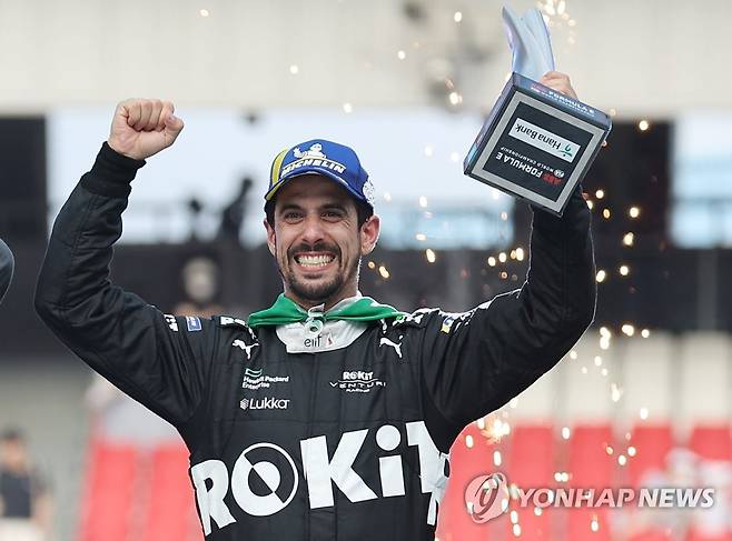 (서울=연합뉴스) 홍해인 기자 = 13일 서울 송파구 잠실올림픽주경기장 일대에서 열린 '2022 하나은행 서울 E-프리(E-Prix)' 15라운드 경기에서 3위를 차지한 로킷 벤추리 레이싱 팀 루카스 디 그라시가 시상식에서 트로피를 들어보이고 있다. 2022.8.13