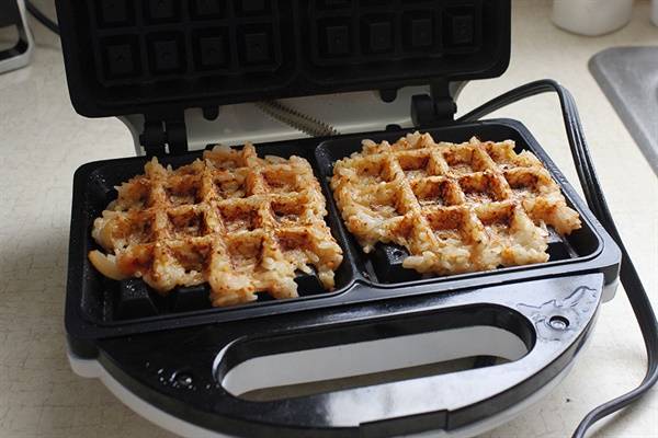 3. 와플기를 충분히 달군 후, 기름을 뿌리고, 적당량의 밥을 와플기에 얹는다.