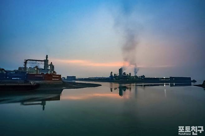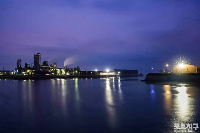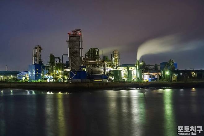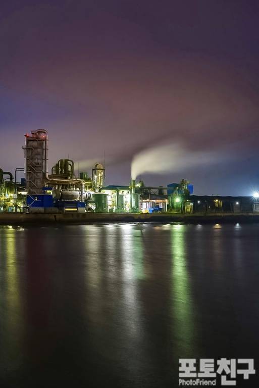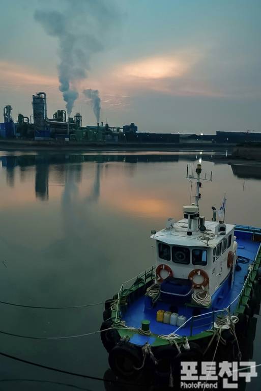 공장 굴뚝의 수증기가 바람에 흩어지고, 바닷물에는 건물의 반영이 생겼습니다.