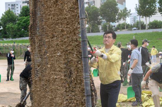 [포토]이기재 양천구청장, 국군장병·자원봉사자와 함께 안양천 침수피해 복구