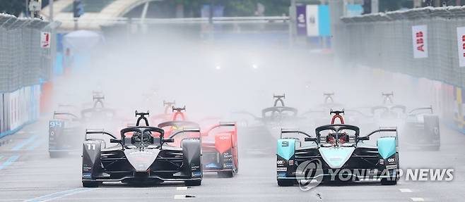 (서울=연합뉴스) 김도훈 기자 = 13일 서울 송파구 잠실올림픽주경기장 일대에서 열린 '2022 하나은행 서울 E-프리(E-Prix)' 15라운드 본경기에서 재규어 TCS 레이싱의 미치 에번스(9번)가 레이스를 이끌고 있다. 2022.8.13