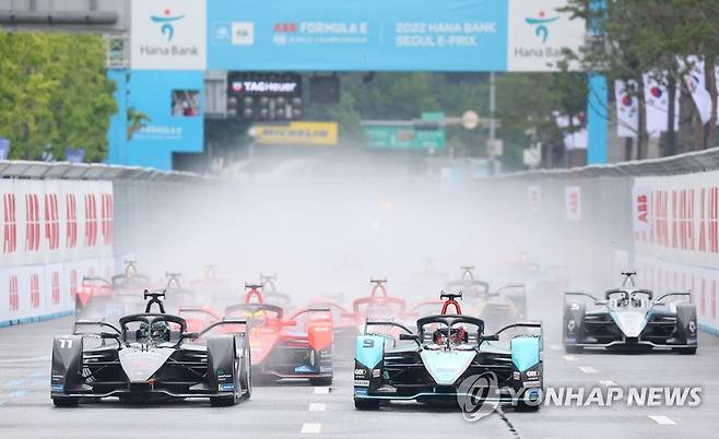 (서울=연합뉴스) 김도훈 기자 = 13일 서울 송파구 잠실올림픽주경기장 일대에서 열린 '2022 하나은행 서울 E-프리(E-Prix)' 15라운드 본경기에서 재규어 TCS 레이싱의 미치 에번스(9번)가 레이스를 이끌고 있다. 2022.8.13