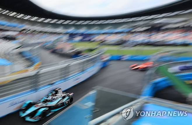 (서울=연합뉴스) 홍해인 기자 = 13일 서울 송파구 잠실올림픽주경기장에서 열린 '2022 하나은행 서울 E-프리(E-Prix)' 15라운드 경기에서 우승을 차지한 재규어 TCS 레이싱의 미치 에번스(왼쪽)가 주경기장을 돌아 외부 트랙으로 향하고 있다. 2022.8.13