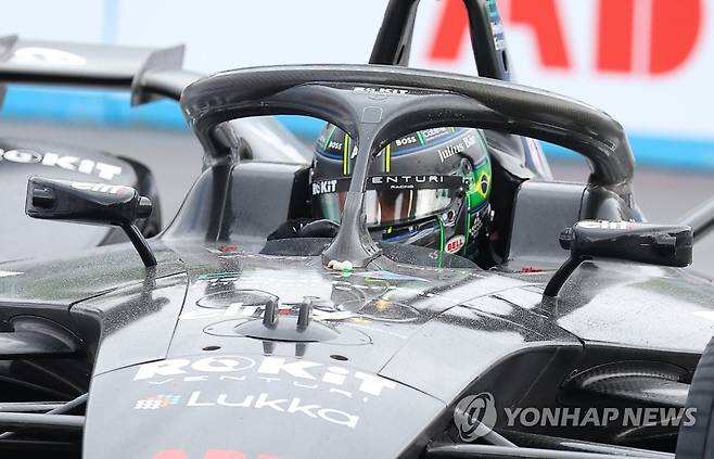 (서울=연합뉴스) 김도훈 기자 = 13일 서울 송파구 잠실올림픽주경기장 일대에서 열린 '2022 하나은행 서울 E-프리(E-Prix)' 15라운드 본경기에서 3위를 차지한 로킷 벤추리 레이싱의 루카스 디그라시(브라질)가 레이스를 펼치고 있다. 2022.8.13