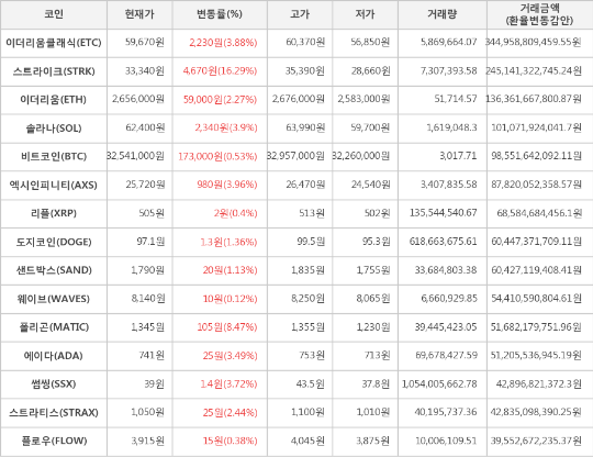 또한, 폴리곤(8.47%, 1,345원), 엑시인피니티(3.96%, 25,720원), 솔라나(3.9%, 62,400원), 이더리움클래식(3.88%, 59,670원), 썸씽(3.72%, 39원), 에이다(3.49%, 741원), 스트라티스(2.44%, 1,050원), 이더리움(2.27%, 2,656,000원), 도지코인(1.36%, 97.1원), 샌드박스(1.13%, 1,790원), 리플(0.4%, 505원), 플로우(0.38%, 3,915원), 웨이브(0.12%, 8,140원)가 상승세를 나타냈다.