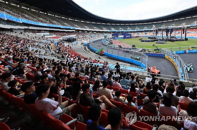 (서울=연합뉴스) 홍해인 기자 = 13일 서울 송파구 잠실올림픽주경기장에서 열린 '2022 하나은행 서울 E-프리(E-Prix)' 15라운드 경기에서 경주차들이 주경기장 트랙을 도는 모습을 관람객들이 바라보고 있다. 2022.8.13