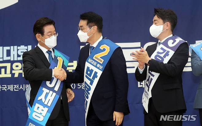[부산=뉴시스] 하경민 기자 = 더불어민주당 이재명 후보가 13일 부산 동구 부산항컨벤션센터에서 8·28 전당대회 부산·울산·경남지역 권리당원 투표결과 압승을 거둔 뒤 다른 후보들과 악수하고 있다. 2022.08.13. yulnetphoto@newsis.com