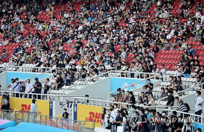 (서울=연합뉴스) 홍해인 기자 = 13일 서울 송파구 잠실올림픽주경기장에서 열린 '2022 하나은행 서울 E-프리(E-Prix)' 15라운드 경기에서 경주차들이 주경기장 트랙을 도는 모습을 관람객들이 바라보고 있다. 2022.8.13