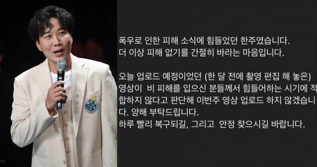 그는 "오늘 업로드 예정이었던 (한 달 전에 촬영 편집해 놓은) 영상이 비 피해를 입으신 분들께서 힘들어하는 시기에 적합하지 않다고 판단해 이번 주 영상 업로드 하지 않겠다. 양해 부탁드린다"고 말했다.