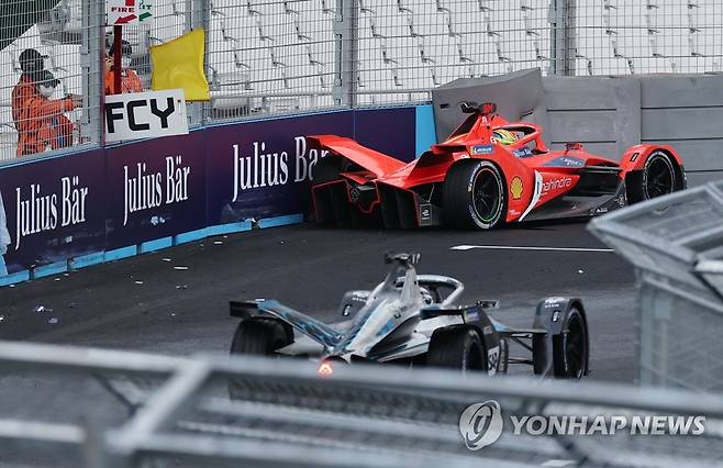 (서울=연합뉴스) 홍해인 기자 = 13일 서울 송파구 잠실올림픽주경기장에서 열린 '2022 하나은행 서울 E-프리(E-Prix)' 15라운드 경기에서 경기 종료를 8분여 앞두고 마힌드라 레이싱 팀의 알렉산더 심즈가 주경기장 내 코너 트랙을 돌던 중 펜스에 부딛치며 트랙을 도는 다른 선수들에게 주의를 당부하며 노란 깃발이 표시되고 있다. 2022.8.13
