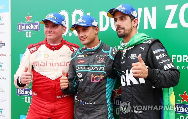 왼쪽부터 2위 마힌드라 레이싱의 올리버 롤랜드(영국),1위 재규어 TCS 레이싱의 미치 에번스(뉴질랜드), 3위 로킷 벤추리 레이싱의 루카스 디그라시(브라질). 2022.8.13
