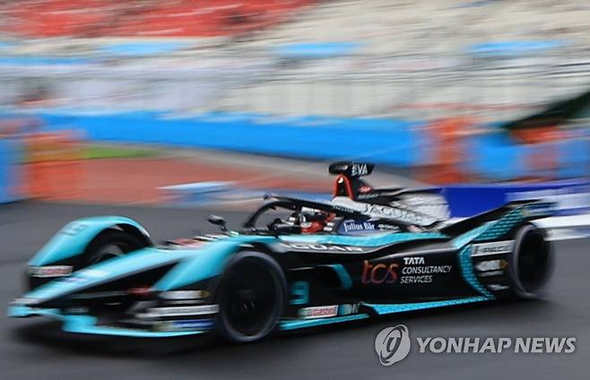 (서울=연합뉴스) 홍해인 기자 = 13일 서울 송파구 잠실올림픽주경기장에서 열린 '2022 하나은행 서울 E-프리(E-Prix)' 15라운드 경기에서 우승한 재규어 TCS 레이싱의 미치 에번스(뉴질랜드)가 주경기장 트랙의 코너를 돌아나오고 있다. 2022.8.13
