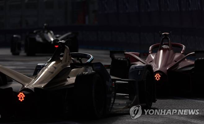 (서울=연합뉴스) 김도훈 기자 = 13일 서울 송파구 잠실올림픽주경기장 일대에서 열린 '2022 하나은행 서울 E-프리(E-Prix)' 15라운드 본경기에서 레이스 머신의 등이 붉게 빛나고 있다. 2022.8.13