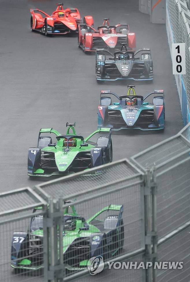 (서울=연합뉴스) 홍해인 기자 = 13일 서울 송파구 잠실올림픽주경기장에서 열린 '2022 하나은행 서울 E-프리(E-Prix)' 15라운드 경기에서 경주차들이 주경기장 내 트랙을 달리고 있다. 2022.8.13