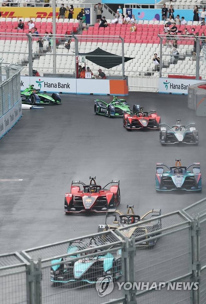 (서울=연합뉴스) 홍해인 기자 = 13일 서울 송파구 잠실올림픽주경기장에서 열린 '2022 하나은행 서울 E-프리(E-Prix)' 15라운드 경기에서 경주차들이 주경기장 내 트랙을 달리고 있다. 2022.8.13